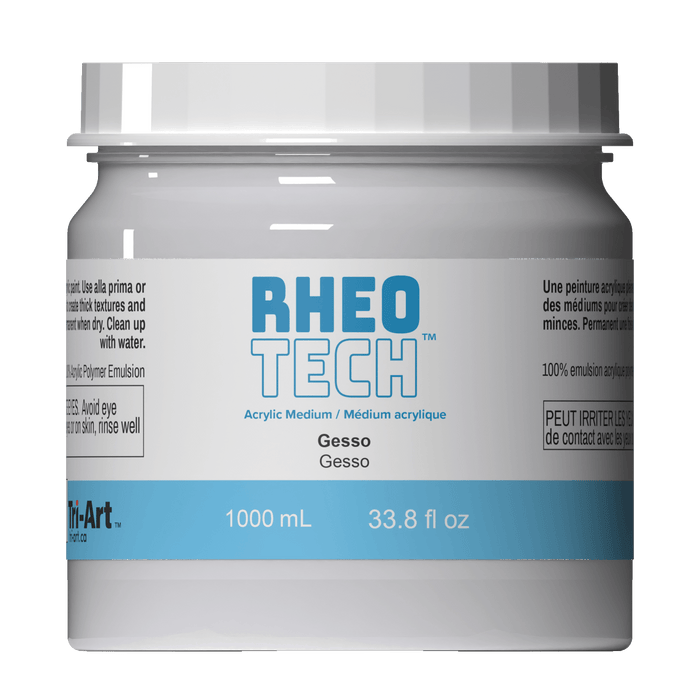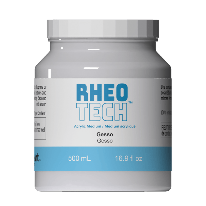 Rheotech’s Acrylic Gesso is made with 100% acrylic and contains calcium carbonate for the best strength, adhesion, coverage and flexibility. It creates a slightly porous ground, suitable for both acrylic and oil paints. Rheotech Gesso dries to a matte, white, opaque finish with a slight tooth that can be sanded to provide a smoother surface. It has excellent adhesion to surfaces and will not lift, crack or chip from the surface. Rheotech Gesso is truly white for a highly reflective ground which will enhance colours. For creating custom reflective coloured grounds, Rheotech Gesso can be tinted with Rheotech Acrylic Colours.